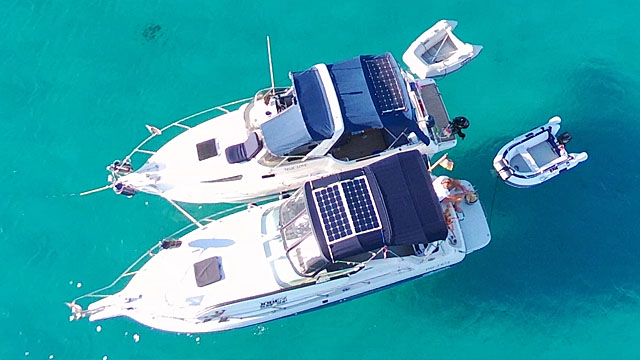 Die ANNI vor der Westküste der Insel Šolta Das Dinghi fährt bei Enno auf der großen Badeplattform mit, der Motor kann dabei montiert bleiben. Für adäquaten Vortrieb sorgt ein Mercruiser 5,7L V8 350MAG