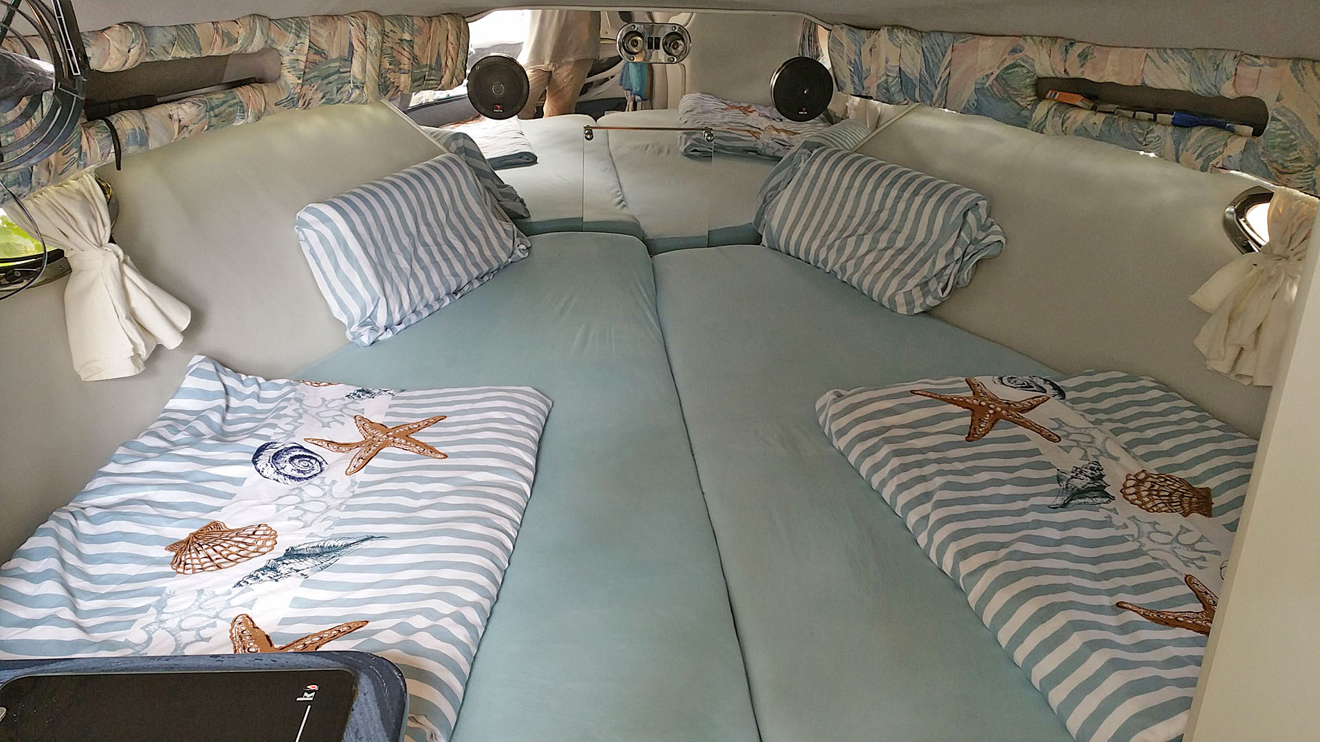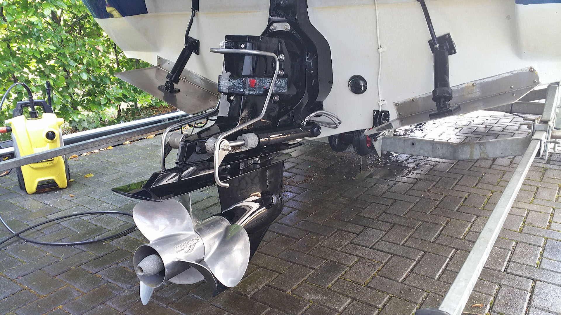 Der Bravo Three Antrieb mit Drive Shower Die Unterflurkabine ist für Ines zum begehbaren Kleiderschrank umfunktioniert, einen weiteren Kleiderschrank hat Enno zusätzlich eingebaut. Auch das Bett in der V-Koje und die Staufächer darunter sind gepimpt !!