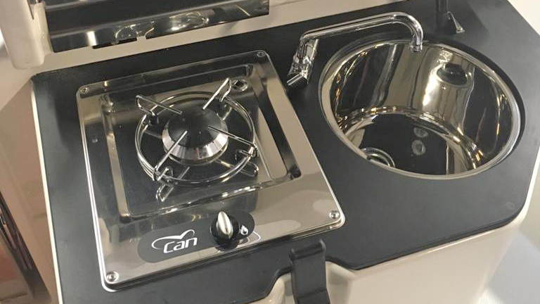 Der Pantryblock mit Edelstahlspüle und Gaskocher befindet sich an der