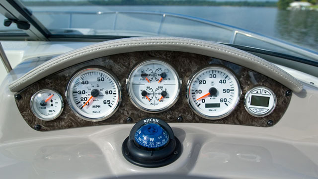 Armaturenbrett Das Armaturenbrett mit 5 chromgefassten Rundinstrumenten fasst in einem zentralen Instrument die vier Anzeigen für Kraftstoff, Batteriespannung sowie Öl- und Wassertemperatur zusammen. Das wirkt insgesamt aufgeräumter, ohne auf wichtige Daten zur Motorüberwachung zu verzichten.