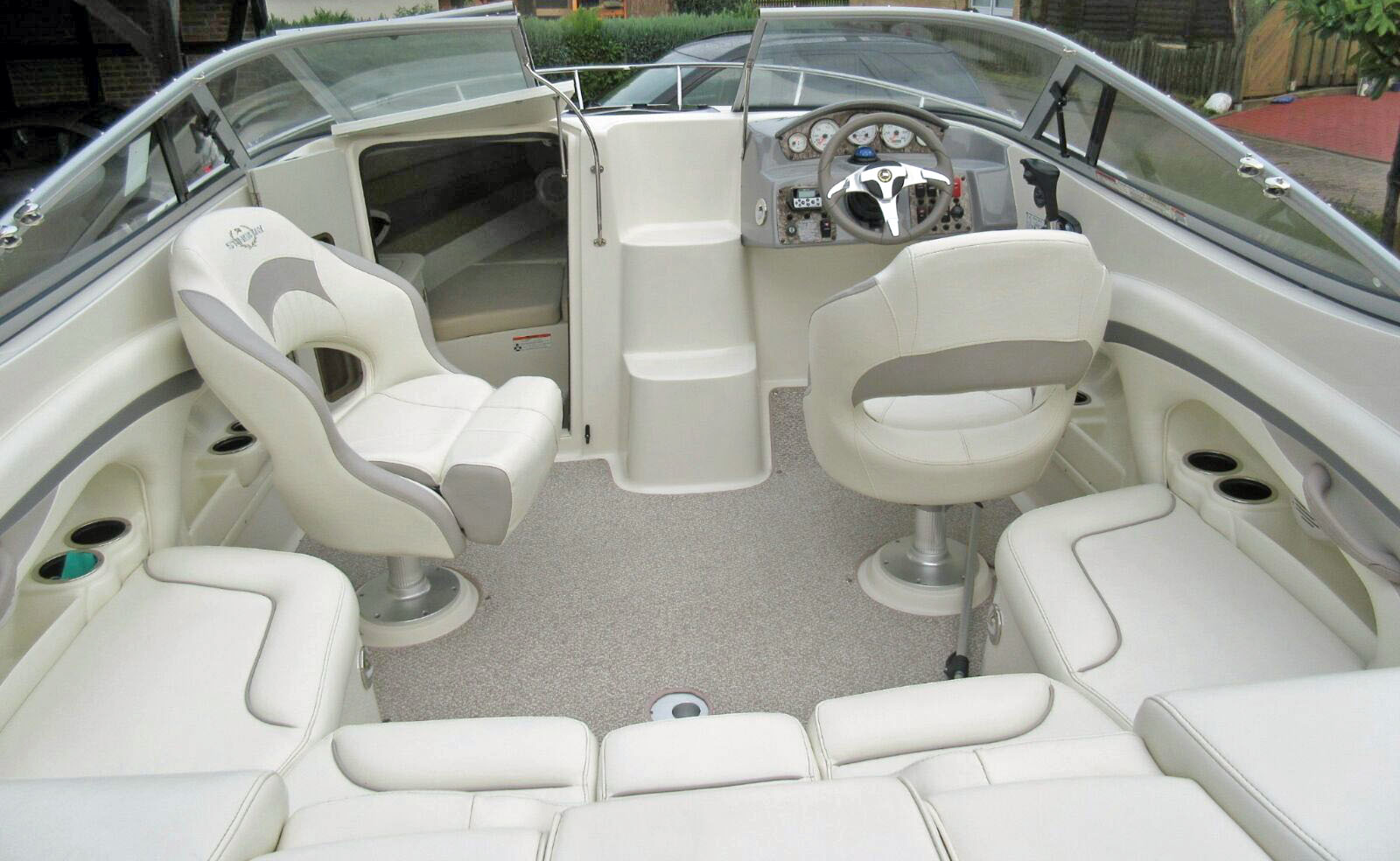Blick in die Plicht Die STARLIGHT bringt alle Merkmale eines Cuddy Cruisers mit: V-Koje, große Liegewiese und Badeplattform. Mit den drehbaren Flip-Up-Einzelsitzen und der U-Sitzbank ist Platz für bis zu sechs Personen in gemütlicher Runde. Der Weg auf den Bug führt über ein zwei integrierte Treppenstufen. Der Bug wiederum ist mit einer geschweißten Edelstahlreling eingefaßt.