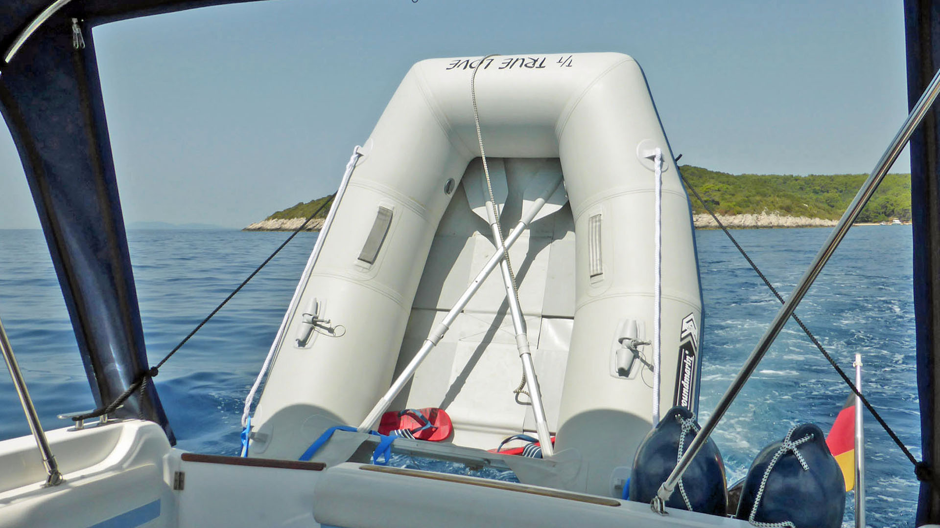 Das Dinghi hat seinen Stammplatz auf der Badeplattform und eignet sich nur bei langsamer Fahrt zum Hinterherschleppen.
