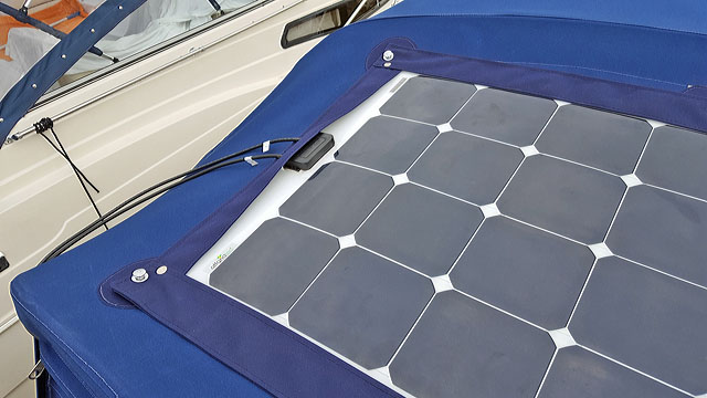 Projekt Solarstrom Die Stromversorgung an Bord kann im Urlaub ohne regelmäßiges Aufladen zum Nadelöhr werden. In früheren Jahren waren uns die Aufenthalte in Häfen unter anderem auch für das vollständige Aufladen der Batterien sehr wichtig. Sonst verbleibt nur die Fahrt unter Motor, um den elektrischen Energiespendern ihre Kraft zurückzugeben. Um künftig von der Sonnenenergie kostenlos zu profitieren, habe ich ein flexibles und dünnes Solarpanel der Firma Offgridtec angeschafft und von unserem Sattler in eine Tasche aus Verdeckstoff einnähen lassen. Das Solarpanel kann mit Tenax-Knöpfen auf den Camper-Verdeck angebracht werden. Entsprechende Aufnahmen mit Verstärkung sind dazu ins Camperverdeck eingearbeitet worden.