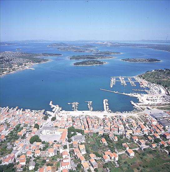 Der Ort Murter am Nordende der Insel - hier von Osten besehen. Rechts im Bild die Marina Hramina und die INA-Tankstelle. Murter aus Richtung Südosten betrachtet. Sehr schön zu erkennen sind die kleinen, vorgelagerten Inseln.
