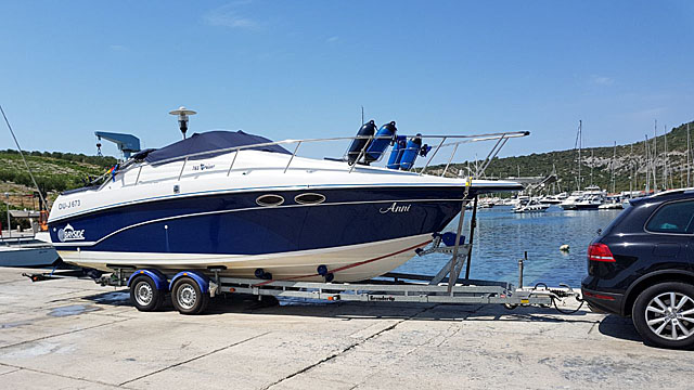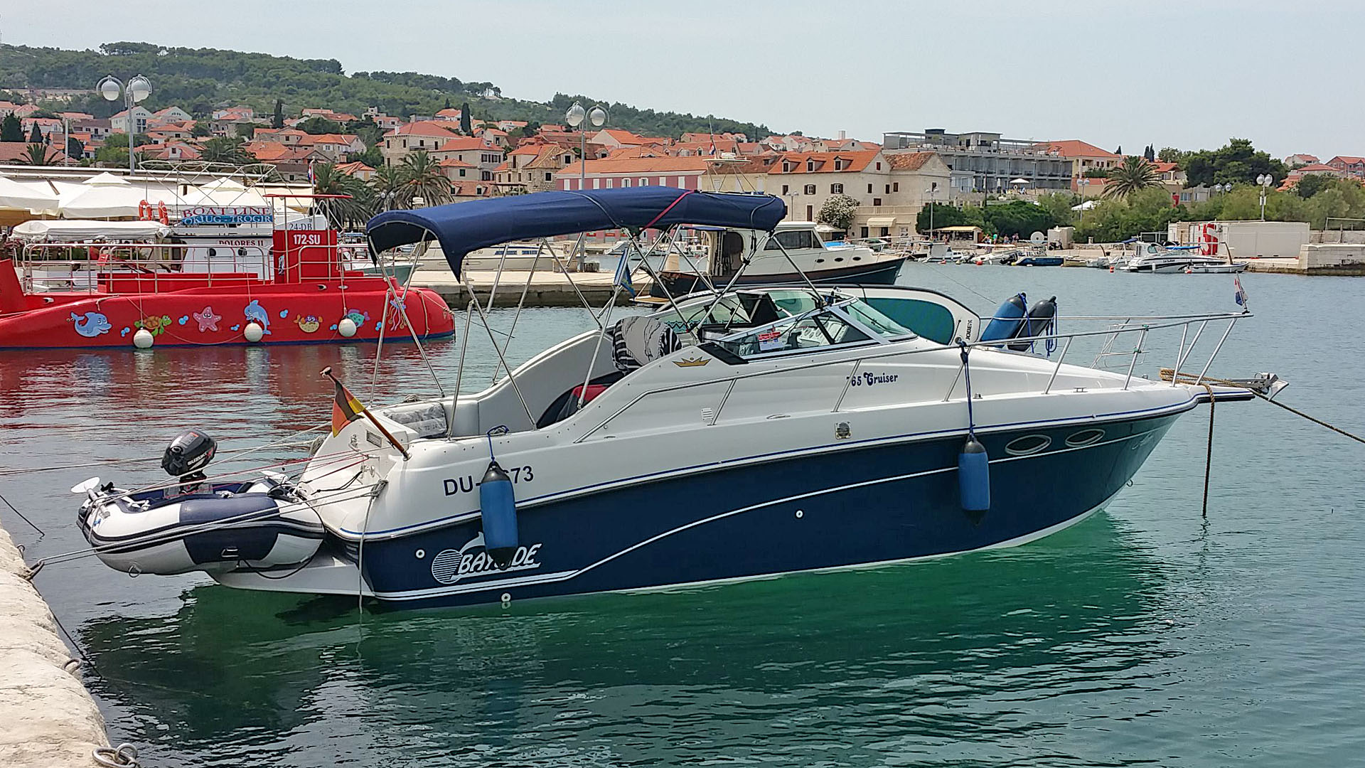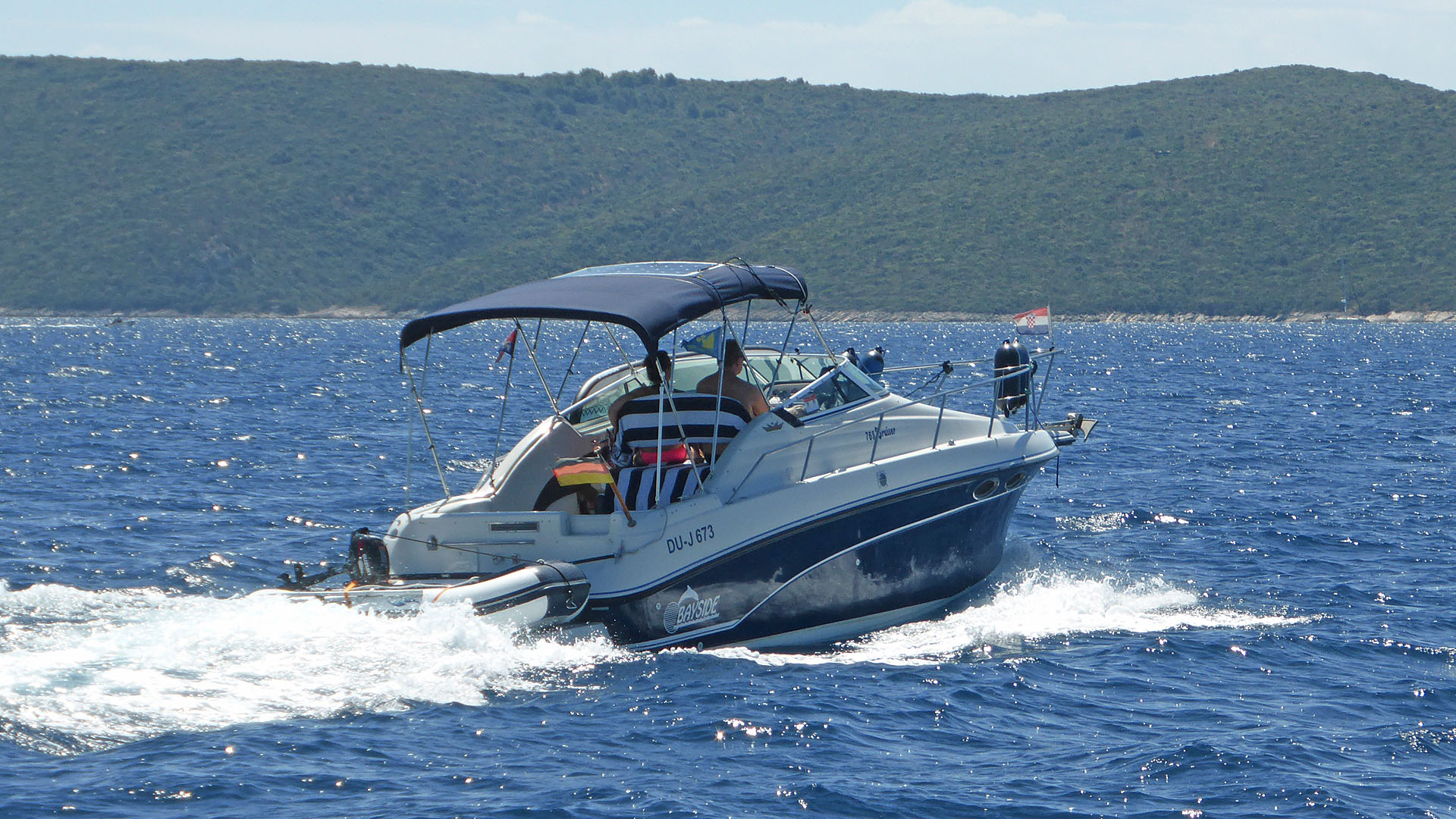 Die ANNI vor der Westküste der Insel Šolta Das Dinghi fährt bei Enno auf der großen Badeplattform mit, der Motor kann dabei montiert bleiben. Für adäquaten Vortrieb sorgt ein Mercruiser 5,7L V8 350MAG
