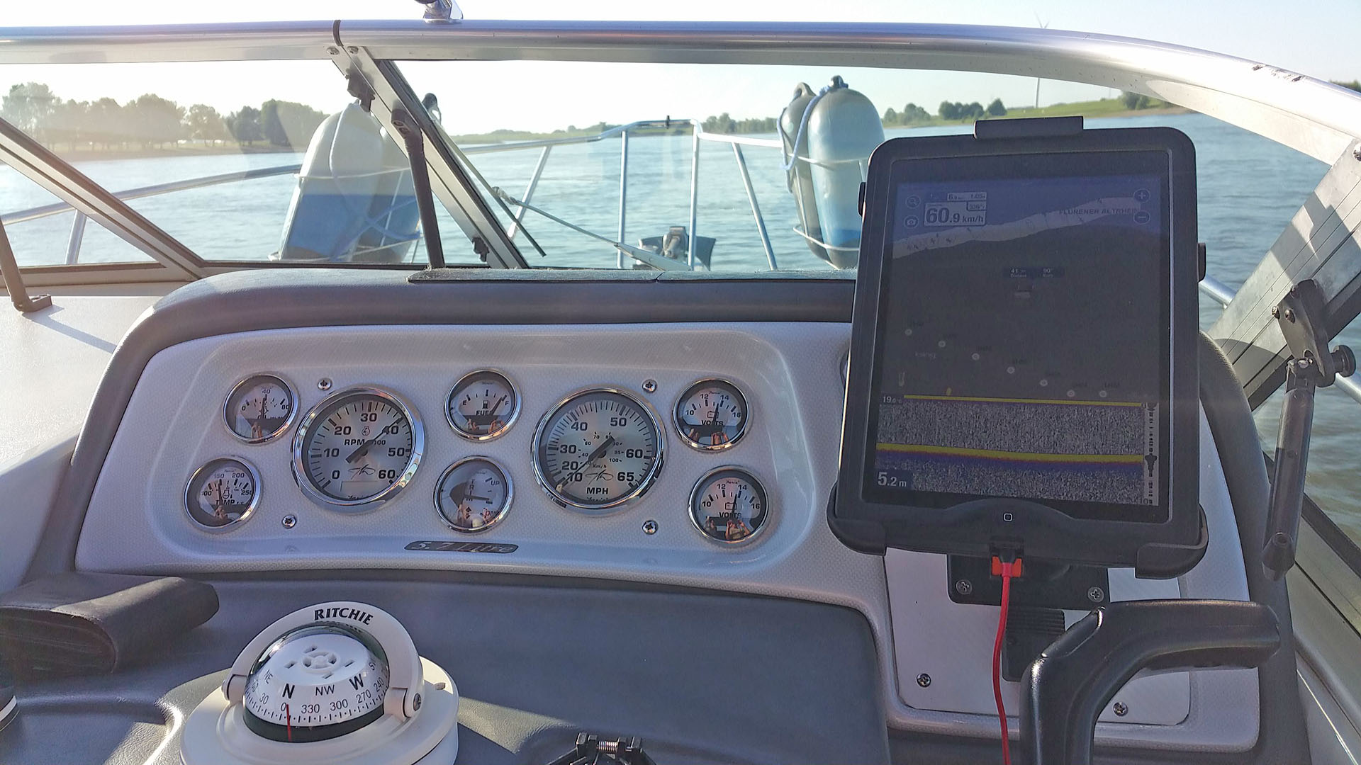Blick ins Cockpit Neben den klassischen, chromgefassten Rundinstrumenten gibt es alle Motor- und Navigationsdaten sowie das Sonarbild auf' dem iPad. Cool...