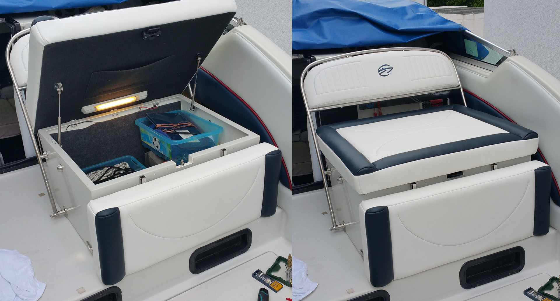Sie fungiert als Sitzbank für das Cockpit, Staufach sowie Liege und Sitzbank mit Blickrichtung achtern.