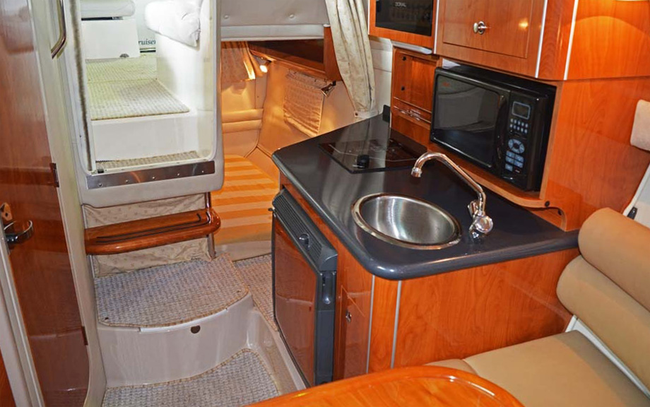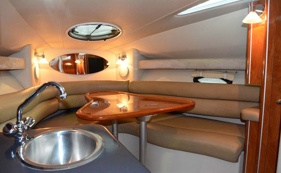 In der Kabine befindet sich eine V-Koje, ein Pantry-Block mit Kühlschrank