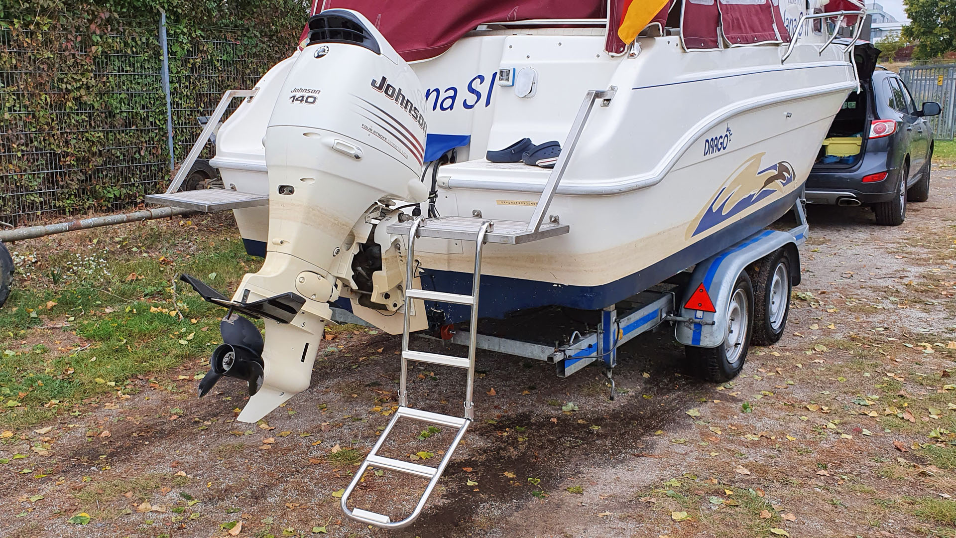 Die Motorisierung ist mit einem weißen Johnson 140 PS (Viertakt) Außenborder sehr solide und sorgt für allzeit sichere Fahrt - auch bei Welle.
