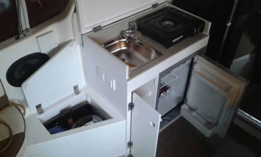 Thomas Einbauten an der Backbordseite bringen Spüle und Kocher in die Plicht, darunter den Kühlschrank und zusätzlichen, gut zugängigen Stauraum, der an Bord der 660 in der Basisausführung Mangelware ist.