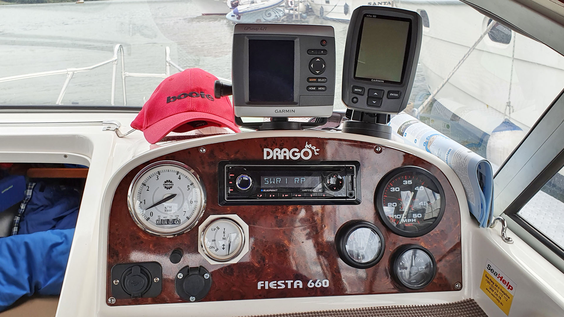 Das Cockpit mit Seekartenplotter und Fishfinder Baugleich mit den 660 Modellen der Werft ist die JANA S II dank Thomas handwerklicher Fertigkeiten in der Plicht schon länger nicht mehr: