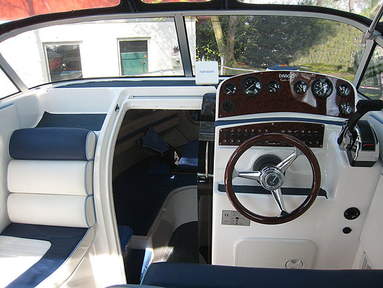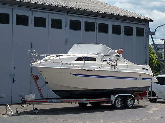 Auf dem Landweg war die KIFFI auf einem 2,7t Wick Tandemtrailer unterwegs. Der Kommandostand für den Skipper ist in klassischer Wurzelholz-Optik gehalten. Heike hat als Beifahrerin eine separate Liege an Backbord, um Ihren Steuermann Thomas angemessen anhimmeln zu können... Die ursprüngliche Ausstattungsliste wurde noch um einige, wichtige Positionen ergänzt, bevor der erste Urlaubstörn auf dem Programm steht.