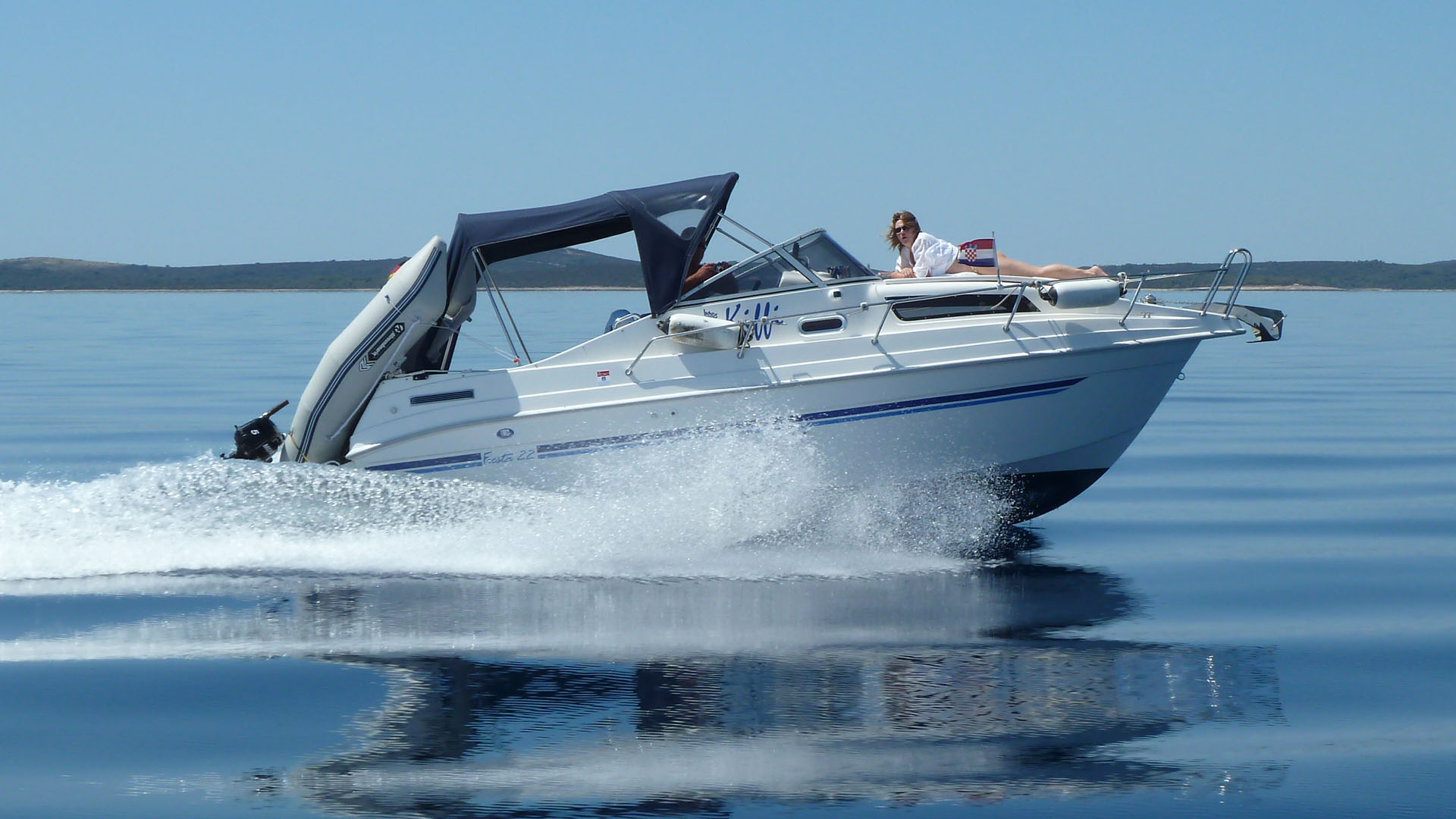 Die KIFFI (II) im Jahr 2011 vor den Insel Dugi Otok Die KIFFI (II) war von 2011 bis 2014 das Boot von Thomas, Heike und Bordhund Lotta. Die Crew war mit der KIFFI an der Mosel, in Mecklenburg und am Mittelmeer unterwegs und wurde auch regelmäßig durch die Töchter Anne und Jana verstärkt. Im Urlaub 2011 war die KIFFI zusammen mit der TRUE LOVE auf Tour durch Norddalmatien und den Kvarner. Nachdem wir nach dem Kauf der TRUE LOVE III gute Erfahrungen mit einem Drago Boot gemacht hatten, haben auch Thomas und Heike sich nach einer passenden Drago umgeschaut. Schließlich wurde eine Drago 22 in der Innenborderversion ins Auge gefasst und im Frühjahr 2011 gebraucht erworben. Die KIFFI wurde wie alle Drago Boote in Griechenland gebaut und dem Erstbesitzer vom Bootshandel Schütze in Berlin-Köpenick im Jahr 2006 ausgehändigt. Dort hat die KIFFI auch ihr Camperverdeck von einem Sattler erhalten. Das Revier des Erstbesitzers waren die Gewässer um die Hauptstadt Berlin. Das Verdeck mit Edelstahl-Gestänge kann dank Verstrebung zu allen Seiten - auch vorne - "offen" gefahren werden. Auch bei "unsichtigem Wetter" gibt es durch die insgesamt 11 (!) Scheiben genügend Licht und Durchblick.