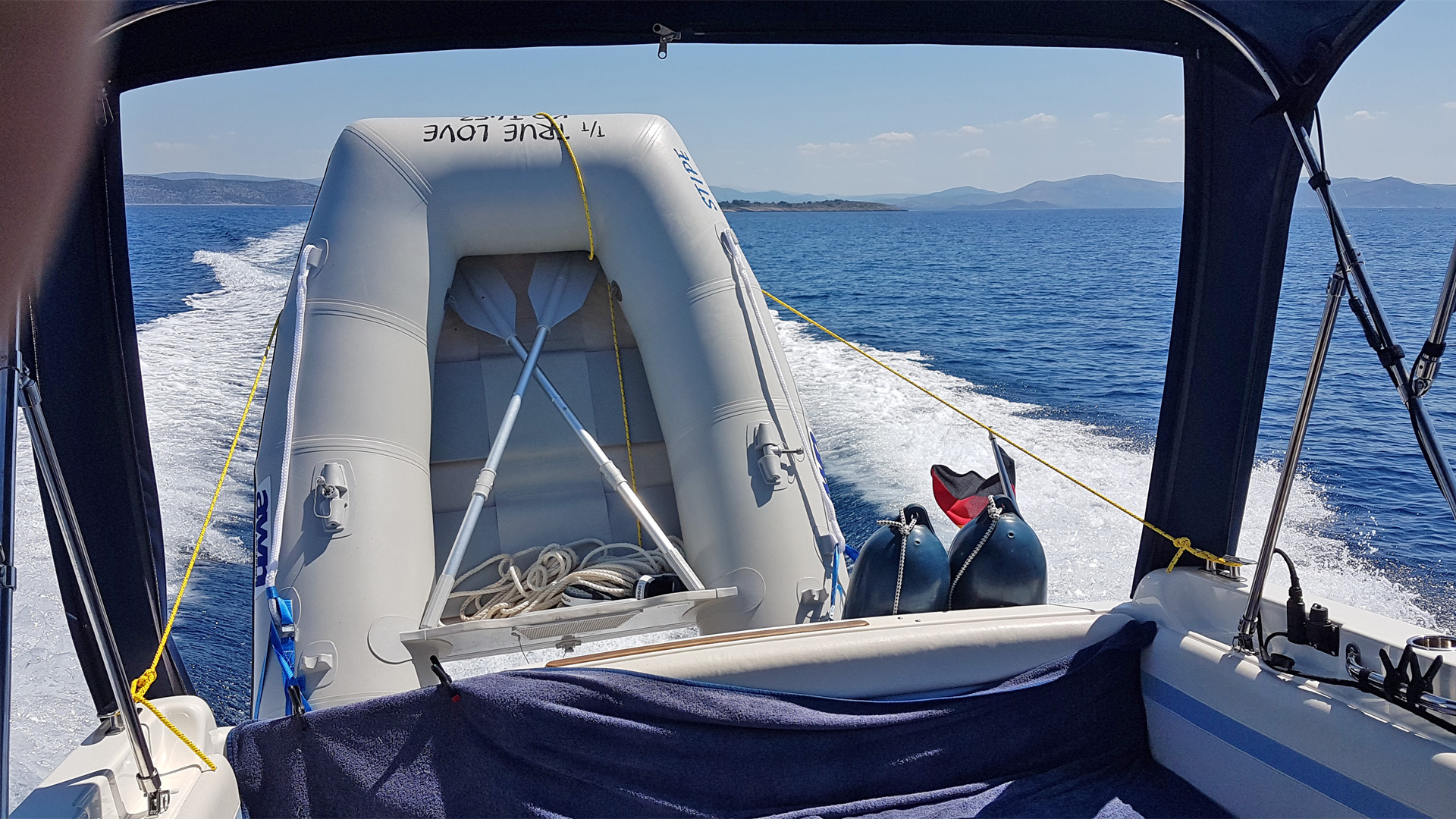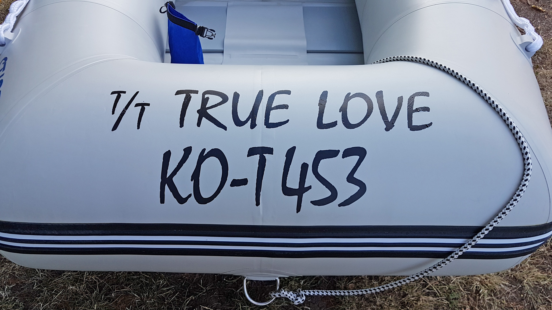 Neben der Bezeichnung T/T TRUE LOVE (d.h. "Tender To TRUE LOVE") gibt es auch eine deutsche Registrierung (KO-T 453). Stipe on Tour Auf der Fahrt in den Urlaub passt das Dinghi übrigens zusammen