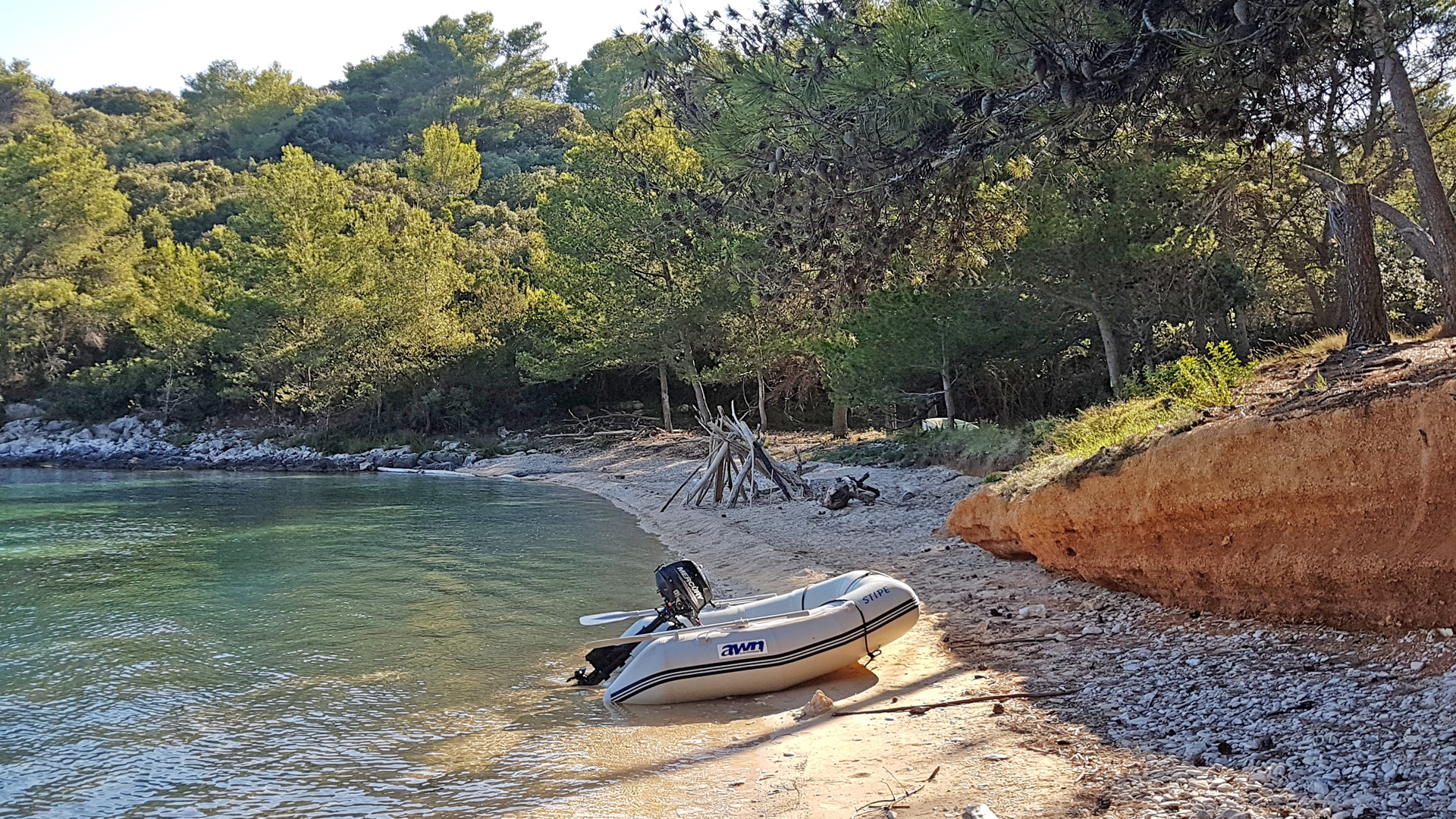 Unser Dinghi "STIPE" Nachdem der bisherige Tender am Ende des Urlaubs 2017 eine Defekt am Tragschlauch erlitten hatte, haben wir uns trotz erfolgreicher Reparatur für einen neuen Begleiter entschieden. Wir haben das baugleiche Modell AWN 200E ausgesucht, da es in der Zwei-Meter Einsteigerklasse über die dicksten Schläuche (Ø 42,5 cm) und das geringste Gewicht verfügt. Dass macht sich dadurch bemerkbar, dass der Boden nicht durchgehend mit Holzbrettern bedeckt ist. Zügige Fortbewegung ist auch in Gleitfahrt - mit einer Person - möglich, denn am Heck kommt weiterhin unser 3,5 PS Hilfsmotor zum Einsatz, der damit auch im Urlaub regelmäßig genutzt wird.