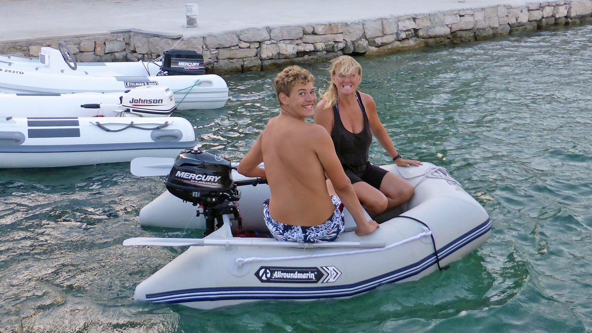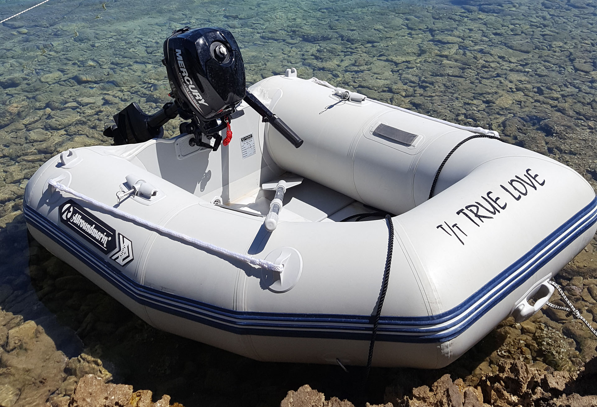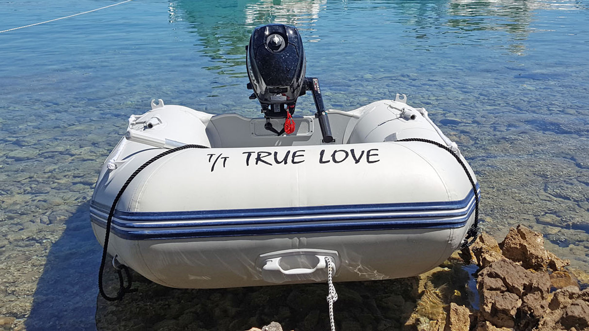 Wie es sich gehört, führt unser Beiboot die Bezeichnung T/T TRUE LOVE (d.h. "Tender To TRUE LOVE") und muss damit in Kroatien nicht separat angemeldet werden. Zügige Fortbewegung ist auch in Gleitfahrt möglich, denn am Heck kommt unser 3,5 PS Hilfsmotor zum Einsatz, der damit auch regelmäßig genutzt wird.