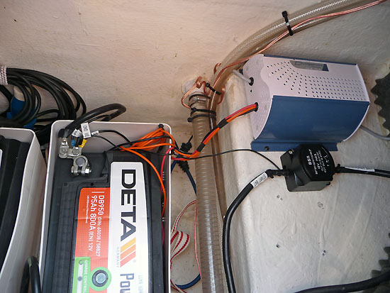 Batterie-Minuspole. Dann sind noch das Landstromladegerät, das