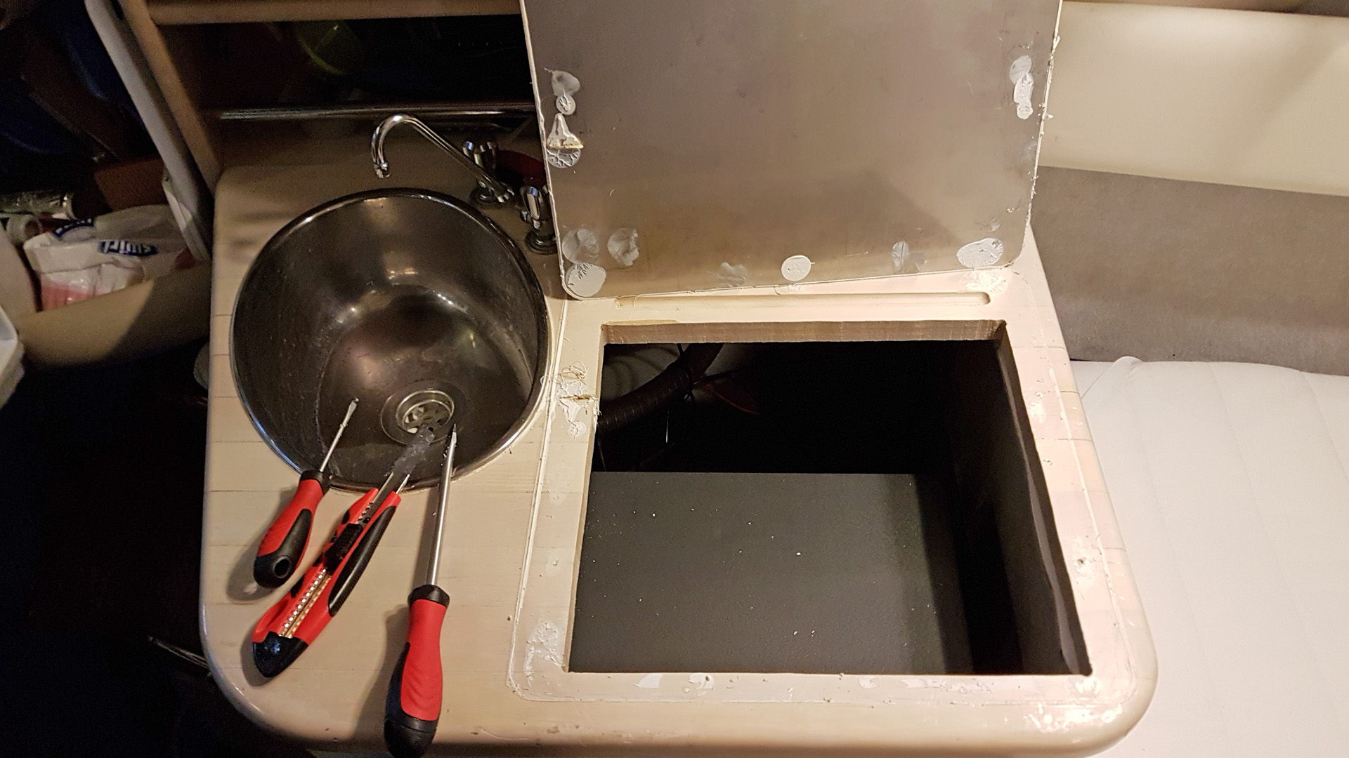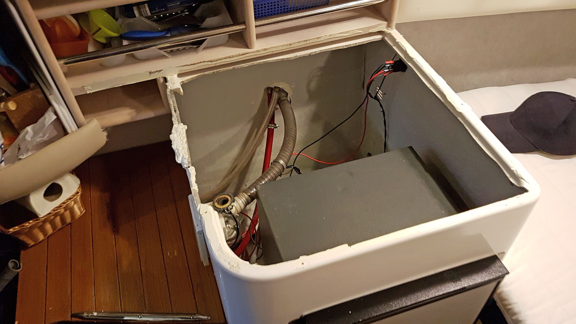 elektrischen Zuleitungen auch der Ablauf per Borddurchlass.