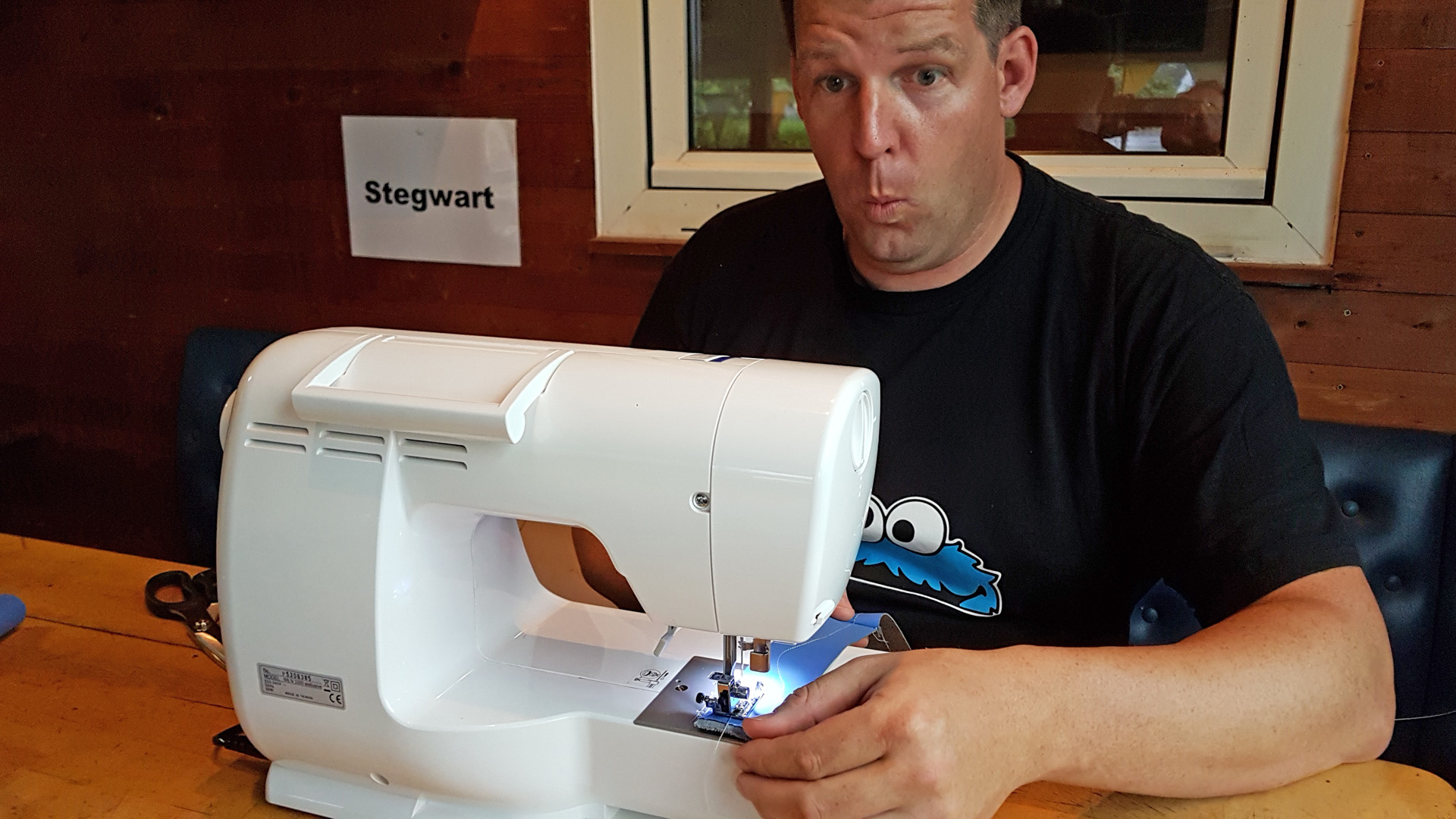 Daniel testet Nähgarn und Stichmuster an einem Reststück des Materials