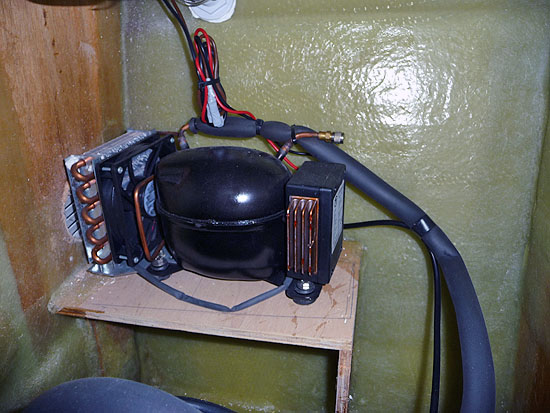 aus Holz. Ein kräftiger Ventilator bläst die Abwärme des Kondensors nach