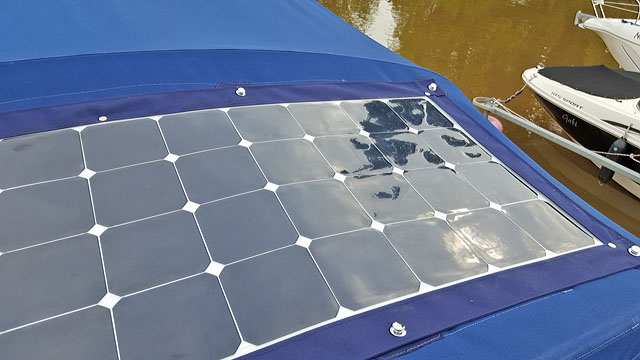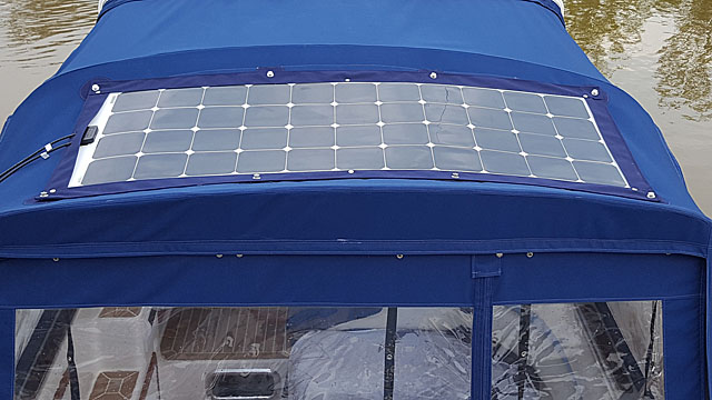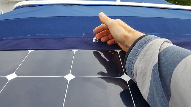 Projekt Solarstrom Die Stromversorgung an Bord kann im Urlaub ohne regelmäßiges Aufladen zum Nadelöhr werden. In früheren Jahren waren uns die Aufenthalte in Häfen unter anderem auch für das vollständige Aufladen der Batterien sehr wichtig. Sonst verbleibt nur die Fahrt unter Motor, um den elektrischen Energiespendern ihre Kraft zurückzugeben. Um künftig von der Sonnenenergie kostenlos zu profitieren, habe ich ein flexibles und dünnes Solarpanel der Firma Offgridtec angeschafft und von unserem Sattler in eine Tasche aus Verdeckstoff einnähen lassen. Das Solarpanel kann mit Tenax-Knöpfen auf den Camper-Verdeck angebracht werden. Entsprechende Aufnahmen mit Verstärkung sind dazu ins Camperverdeck eingearbeitet worden.
