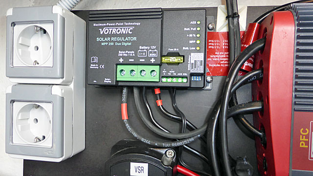 Über einen Solarregler der Firma Votronic kann der von Panel erzeugte Ladestrom zu den Bordbatterien geleitet werden. Der Ladestrom ist ausreichend, um die Stromentnahme von Kühlschrank und Kühlbox während eines kroatischen Urlaubstages zu kompensieren. Das Solarregler lädt die Verbraucherbatterie nach modernsten Erkenntnissen unter Anwendung der IU1oU2-Kennlinie. Ein separater Temperatursensor an der Verbraucherbatterie sorgt dafür, dass die Batterien beim Ladevorgang nicht überhitzen. Zur Überwachung verwende ich einen LCD Batterie Computer, der mir alle wichtigen Informationen zur Stromversorgung liefert.