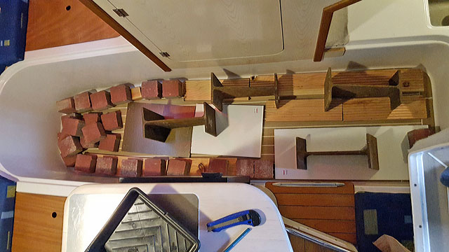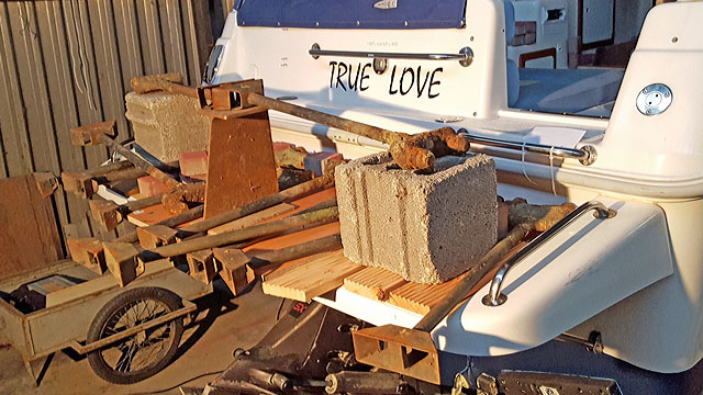 Eisenelemente und Steine herangeschafft sowie Holzplatten passend zurecht