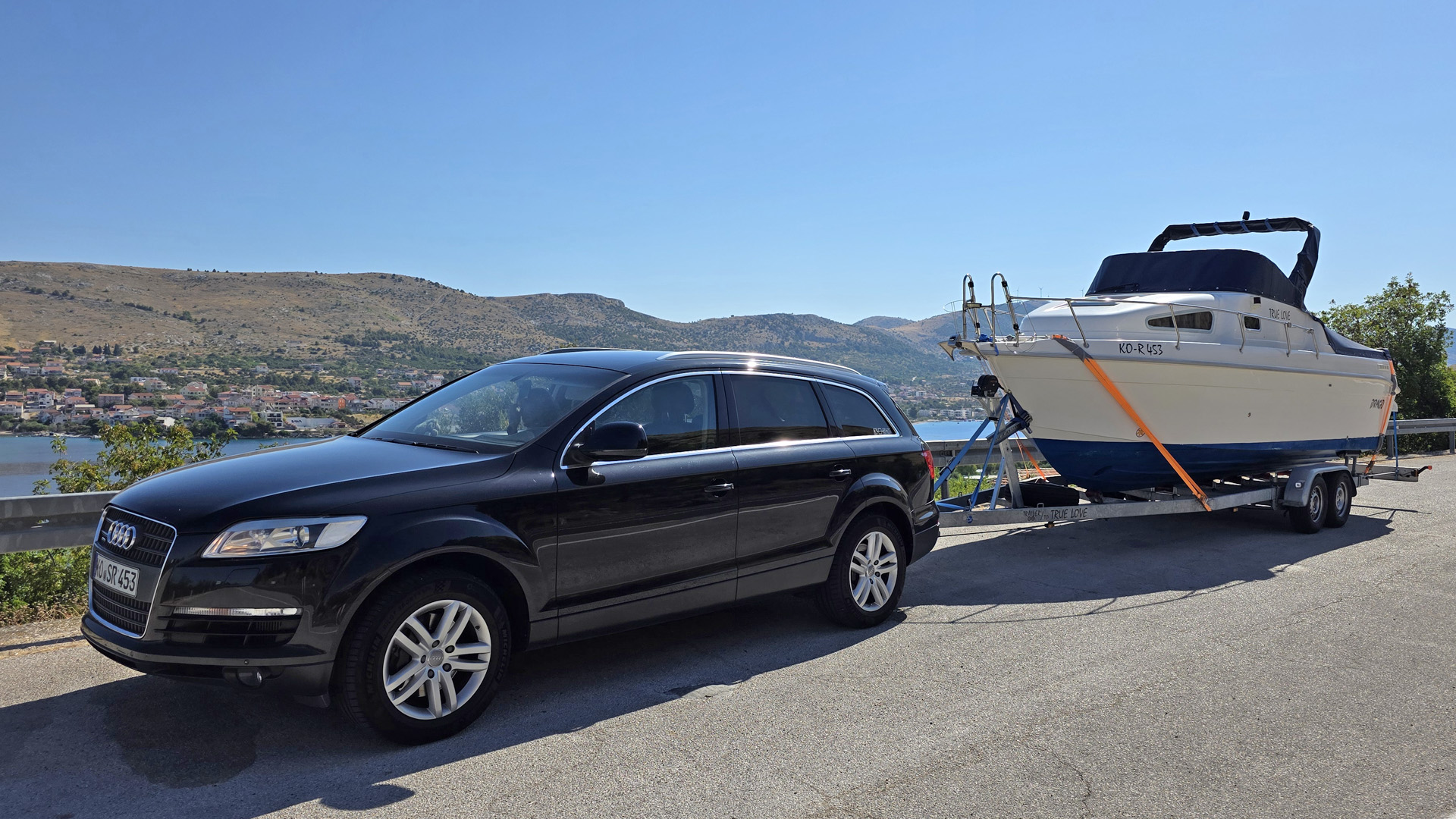 Der Landtransport erfolgt auf einem 3,5t Tandem-Trailer der Firma TPV. Die Fahrperssening wurde von der Sattlerei Wetterfest für uns maßgefertigt und schützt auch den Geräteträger bei Wind und Wetter. Als Zugfahrzeug für unser kostbares Stück wird ein bärenstarkes SUV benötigt. Daher haben wir seither einen Audi Q7 3.0 TDI mit 3,5t Anhängelast im Fuhrpark.
