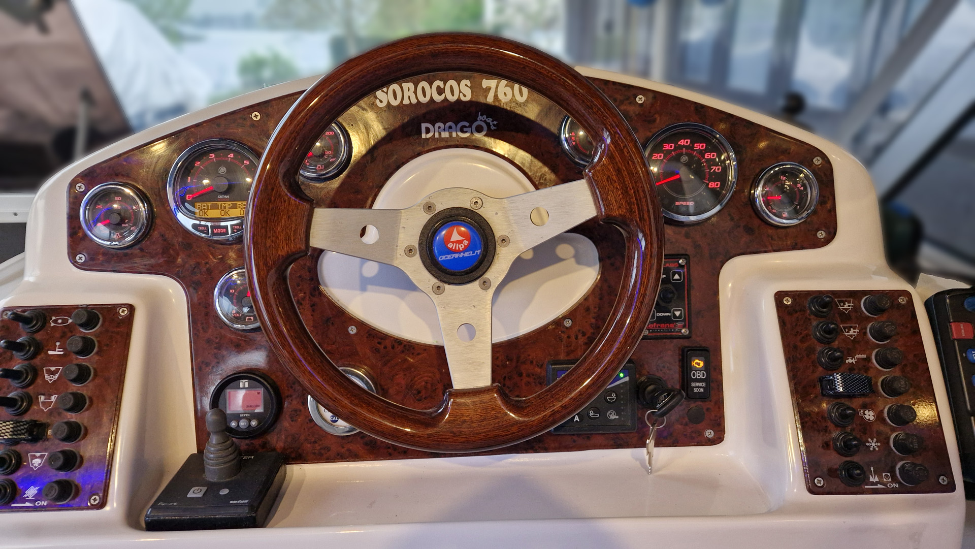 Das typische Drago-Cockpit im "Old-School" Look Der Steuerstand versorgt den Skipper mit den wichtigsten Informationen über neun Rundinstrumente und einen Magnetkompass. Neben den klassischen Zeigerinstrumenten zur Motorüberwachung sind hier auch digitalen Anzeigen des Echolots und des Kettenzählwerk untergebracht. Die primäre Bordelektrik wird über 16 Schalter aktiviert, für die Bedienung des Bugstrahlruders, des Trimm-Systems und der Ankerwinde gibt es separate Bedienpanel. Die Winde kann auch mit Funkfernsteuerung bedient werden. Die TRUE LOVE verfügt zusätzlich über ein kombiniertes See- und Binnenfunkgerät. Die Navigation erfolgt nicht mehr über einen separaten Seekartenplotter, sondern mit Tablet und Navigationssoftware. Hier kommt sowohl Binnen als auf See die BoatingHD-App von Navionics zum Einsatz.