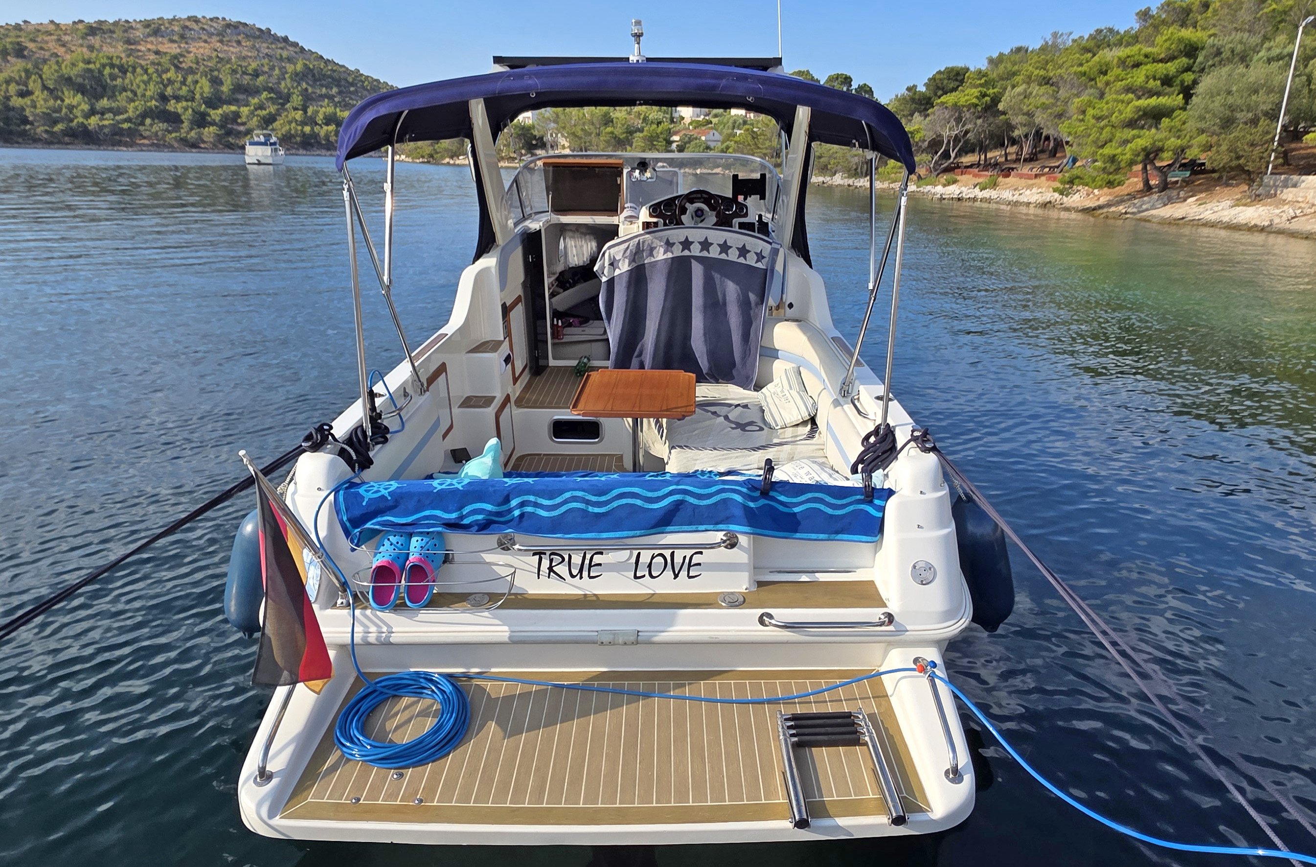 Die durchgehende Badeplattform kennzeichnet die TRUE LOVE als Innenborder Die TRUE LOVE ist ein klassischer, trailerbarer Cabin Cruiser mit einer Eigner- sowie einer Unterflurkabine. In der Kabine befindet sich neben den 2 + 2 Kojen weiterhin die Pantry und ein Bad/WC-Raum. Viel wichtiger war und ist uns jedoch die geräumige Plicht - der Ort, an dem man die meiste Zeit an Bord verbringt. Hier gibt es eine große Sonnenliege und eine geräumige Sitzgruppe zum Herumlümmeln.