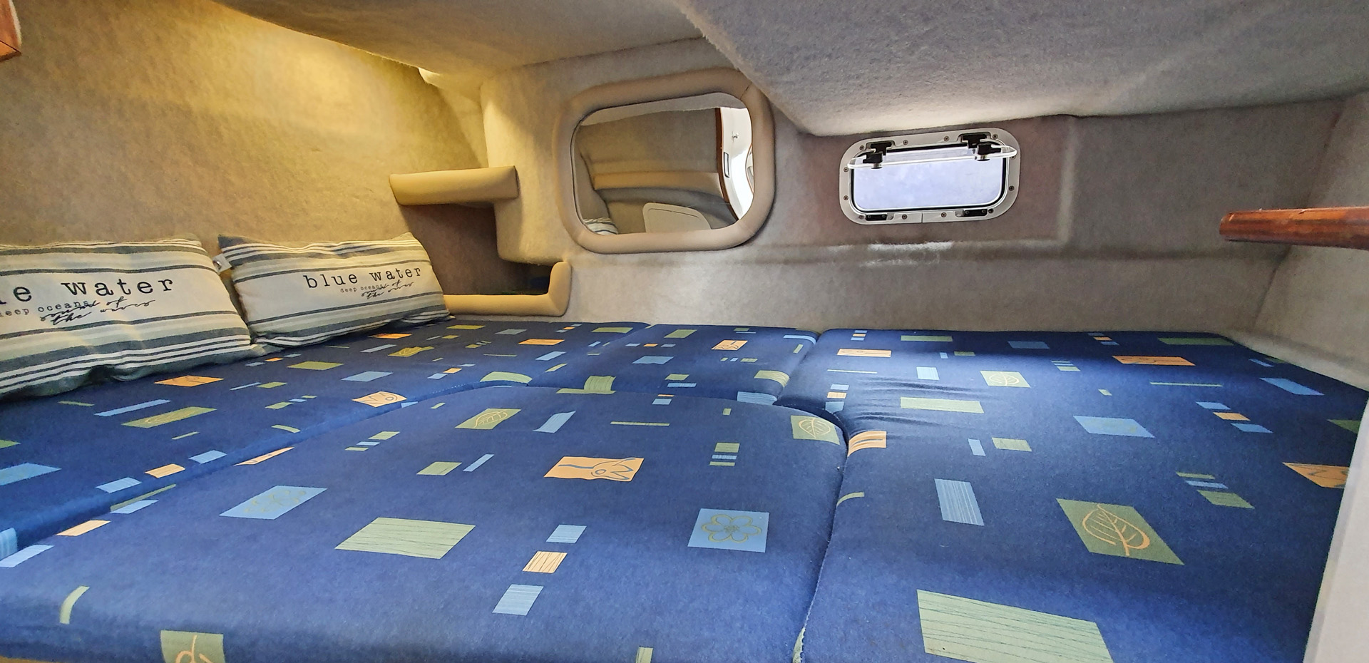 Blick in die V-Koje im Bug Das Design dieses Modells ist eher klassisch als sportlich ausgelegt und folgt kompromisslos den praktischen Erfordernissen. Im Gegensatz zu vergleichbaren amerikanischen Modellen dieser Größe ist die Plicht tiefer als der Steuerstand angeordnet. Wie auch bei der Vorgängerin erreicht man den Bug über die Gangborde neben dem Cockpit. Ein Durchstieg durch die einteilig ausgeführte Windschutzscheibe ist daher nicht erforderlich. Insgesamt wirkt sich die gesamte konstruktive Auslegung bei der Handhabung des Bootes sehr positiv aus, wie z.B. beim An- und Ablegen, Festmachen oder beim Aufholen und Durchreichen der Muring.