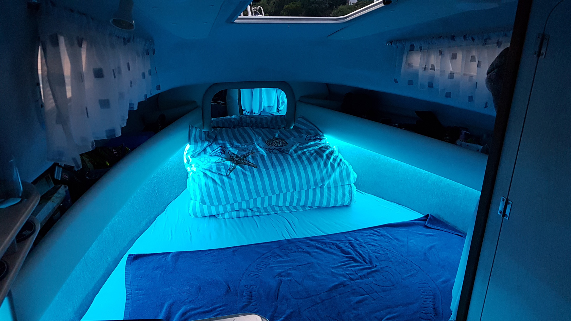 Die Unterflurkabine bietet zwei zusätzliche Kojenplätze Am Steuerstand finden gleich zwei Person auf der breiten Sitzbank bequem nebeneinander Platz. Klappt man die Sitzbank nach vorne, kommt ein sehr geräumiger Stauraum zum Vorschein. In der Plicht dominiert die große Sonnenliege, die die gesamte Bootsbreite einnimmt. Darunter liegt der Motorraum. An der Steuerbordseite schließt sich eine L-Sitzgruppe an, unter der sich weiterer Stauraum befindet. In der Mitte kann ein solider Teak-Tisch montiert werden, sodass hier die Crew beim Cocktail oder Dinner bequem Platz nehmen kann. An der Steuerbordseite der Plicht sind insgesamt drei Stauschränke in der Seitenwand eingelassen. Weiterhin sind drei Treppenstufen integriert, um sicher an den Steg, auf das Nachbarboot oder über das Gangbord auf das Vordeck zu gelangen.