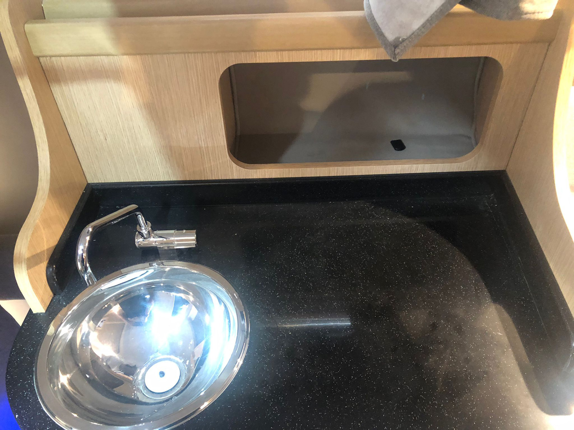 der Pantryblock, rechts der WC-Raum mit Waschbecken.
