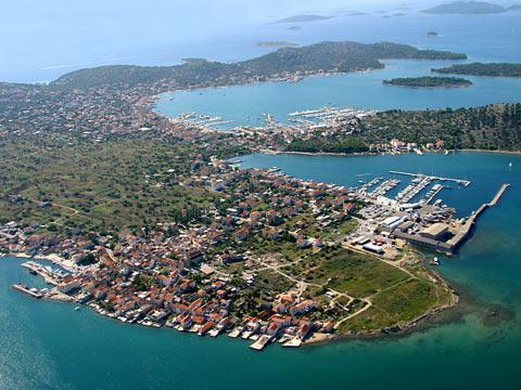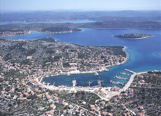 Der Ort Murter am Nordende der Insel - hier von Osten besehen. Rechts im Bild die Marina Hramina und die INA-Tankstelle. Murter aus Richtung Südosten betrachtet. Sehr schön zu erkennen sind die kleinen, vorgelagerten Inseln.