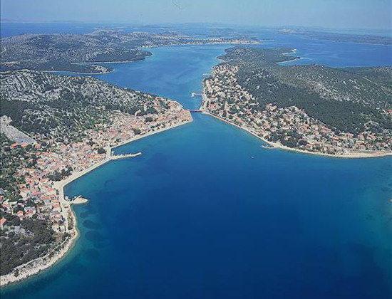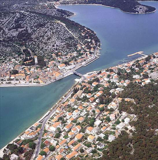 Die Anfahrt zur Insel erfolgt über den Ort Tisno, nur eine 37m lange Brücke verbindet die Insel Murter (links) vom Festland (rechts). Der Ort Tisno liegt auf beiden Seiten der Brücke.
